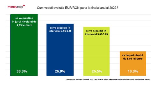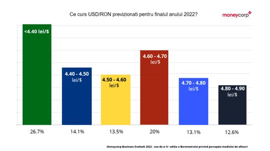 “Avand in vedere euroizarea economiei, constanta cursului leului a fost un factor de stabilitate, fara de care nivelul inflatiei ar fi fost mai ridicat. Ramane de vazut daca Banca Nationala, prin instrumentele pe care le are la dispozitie, va putea sa mentina acest interval. Provocarile vor veni din zona macroeconomica, din evolutia internationala si din performanta comertul exterior. Avem, din pacate, semnale negative in privinta balantei de plati si nu ne ramane decat sa speram ca autoritatile vor accesa cu succes fondurile din PNRR si celelalte finantari europene care, impreuna, pot contribui decisiv la stabilitatea cursului’’, afirma Cosmin Bucur, Managing Director Moneycorp Romania.In privinta cursului dolarului american, cei mai multi dintre manageri (26,7%), vad un dolar sub nivelul de 4,4000 lei, iar 20% in intervalul 4,6000-4,7000 lei. 12,6% mizeaza pe o depreciere semnificativa a monedei nationale, undeva in intervalul 4,8000-4,9000 lei/dolar.