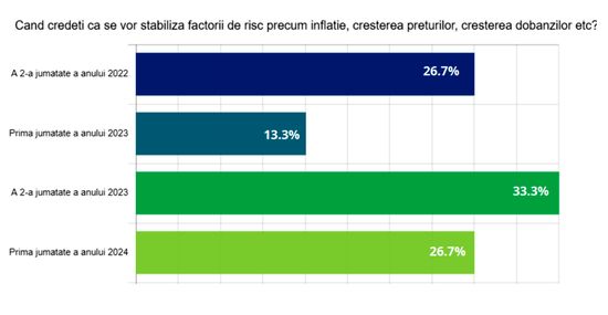 Cei mai multi dintre executivi chestionati (33.3%) vad o stabilizare a factorilor de risc precum inflatia si cresterea dobanzilor abia in a doua parte a anului viitor, in timp ce 26,7% sunt chiar mai pesimisti, indicand un prim semnal pozitiv pe aceasta zona abia in primul semestru din 2024.