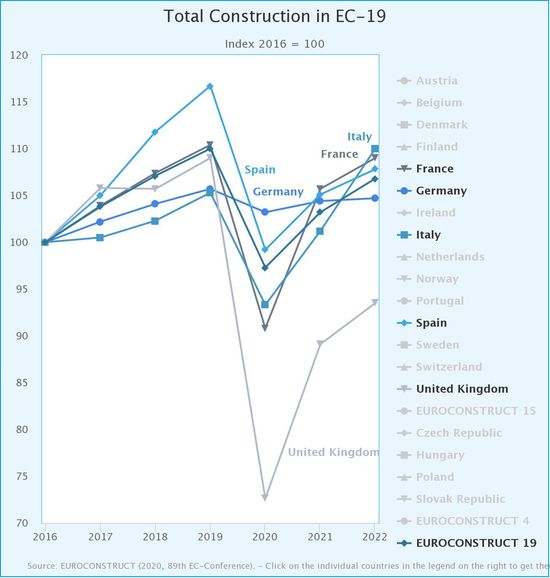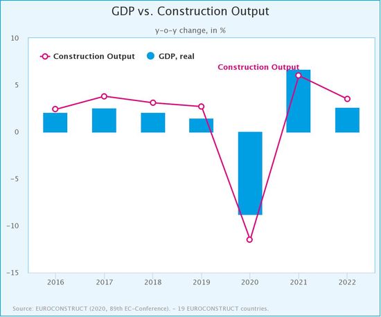 Aceasta prabusire a pietei este similara celei declansate de criza financiara globala din 2009. Valoarea totala a productiei din constructii este asteptata sa ajunga la circa 1.500 de miliarde de euro, nivel corespunzator celui din 2015, la care ajunsese dupa mai multi ani consecutivi de scadere. Cu cateva exceptii, toate pietele de constructii EC 19 vor inregistra scaderi in 2020, cele mai abrupte contractii fiind estimate in Marea Britanie si Irlanda, de -33%, respectiv -38%. Scaderi usoare (de cel mult -2%) sunt asteptate in Finlanda si Elvetia, in timp ce pietele din Portugalia si Polonia vor inregistra noi cresteri. Aceste date indica un impact diferit al pandemiei de coronavirus asupra diferitelor tari monitorizate de Euroconstruct, insa, la nivel general, toate cele 19 piete de constructii vor inregistra o crestere contextuala medie de 6% in 2021, dupa care va reveni la o majorare de 3% in 2022, urmand a atinge valori similare celor din 2018.