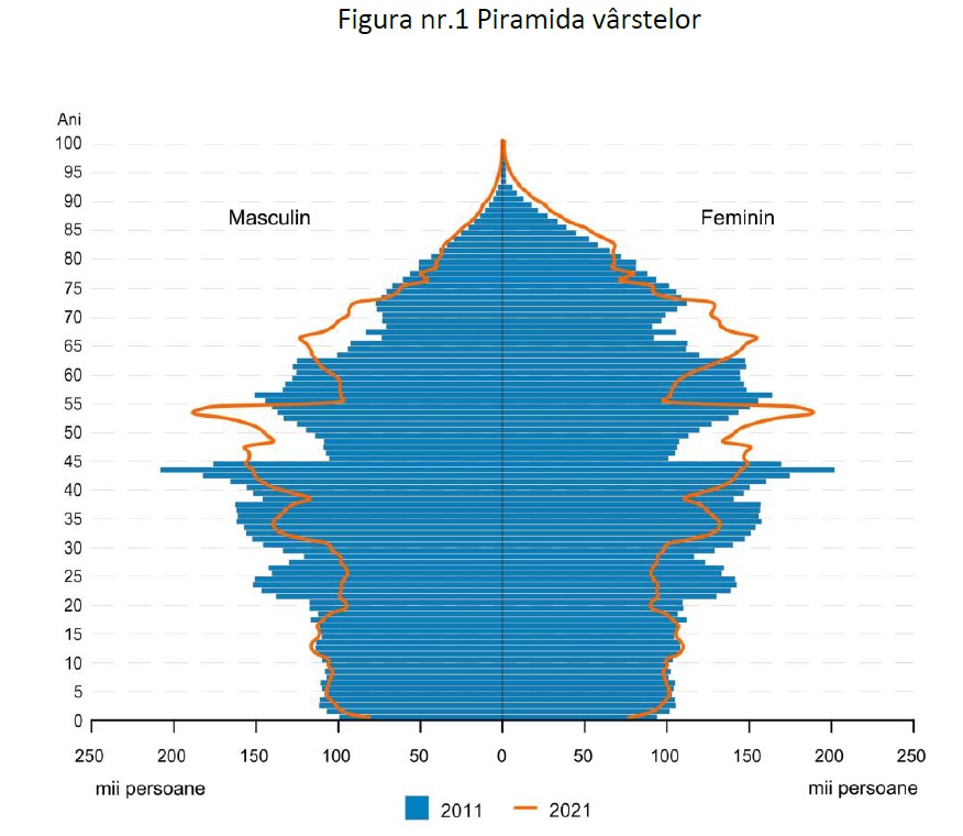 Populatia Romaniei a scazut cu 1,1 milioane de locuitori in ultimii zece ani iar ponderea populatiei de peste 65 de ani a crescut cu aproape jumatate de milion de persoane, la aproape 20% din total, potrivit rezultatelor Recensamantului din 2022 (RPL 2021), publicate de Institutul National de Statistica. In total, populatia rezidenta a Romaniei estr de 19.053.815 persoane, din care: circa 9,8 milioane (reprezentand 51,5%) de sex feminin si 9,9 milioane (reprezentand 52,2%) locuitori ai mediului urban."Procesul de imbatranire demografica s-a adancit, comparativ cu 10 ani in urma, remarcandu-se cresterea ponderii populatiei varstnice (de 65 ani si peste). Indicele de imbatranire demografica s-a depreciat cu aproape 20 de puncte procentuale, crescand la 121,2 persoane varstnice la 100 persoane tinere (RPL 2021) comparativ cu 101,8 (RPL 2011). Desi numarul tinerilor (sub 15 ani) a scazut cu 115.700 de persoane, ponderea lor in total populatie a urcat usor, la 16,1% (fata de 15,9% la RPL2011), in timp ce ponderea populatiei de 65 ani si peste in total populatie a inregistrat o crestere cu aproape jumatate de milion de persoane, respectiv cu 3,5 puncte procentuale (de la 16,1% la RPL2011 la 19,6% la RPL2021). Astfel, raportul de dependenta demografica a crescut in decurs de un deceniu de la 47 (RPL 2011) la 55,5 persoane tinere si varstnice la 100 persoane adulte (la RPL 2021)", arata datele INS.