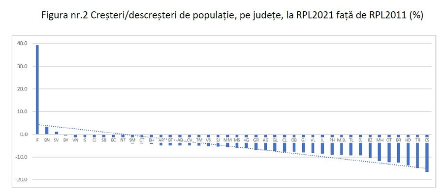 Fata de populatia rezidenta inregistrata la recensamantul precedent (RPL 2011), Romania a pierdut 1,1 milioane locuitori. Din 42 de judete (inclusiv municipiul Bucuresti), 39 au pierdut din numarul de locuitori. Exceptiile le constituie judetul Ilfov care a castigat 153.900 de persoane, dar si judetele Bistrita-Nasaud si Suceava, care au castigat 9.800, respectiv 7.700 de locuitori. In valori relative, cele mai mari reduceri de populatie le-au inregistrat judetele Caras-Severin (-16,6%, respectiv cu 49.000 de persoane mai putin) si Teleorman (-14,9%, respectiv cu 56.600 de persoane mai putin). In valori absolute, municipiul Bucuresti a inregistrat cea mai mare pierdere de populatie, de 166.400 de persoane (-8,8%), urmat de judetele Prahova (-67.800, reprezentand 8,9%) si Dolj (-61.100, reprezentand 9,3%).