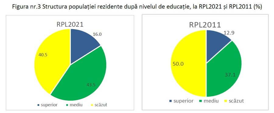 Din totalul populatiei rezidente, 43,5% au nivel mediu de educatie (postliceal, liceal, profesional sau tehnic de maistri), 40,5% nivel scazut (primar, gimnazial sau fara scoala absolvita) si 16% nivel superior. La RPL 2021 erau analfabete 143.600 de persoane (fata de 245.400 la RPL 2011).