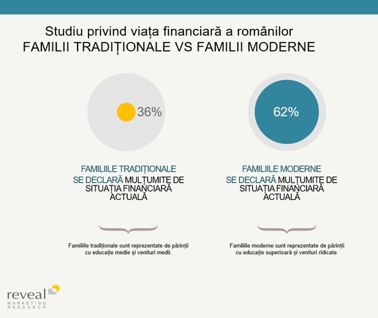 Desi, familiile traditionale inregistreaza valori scazute in ceea ce priveste multumirea fata de situatia financiara, acest lucru nu ii impiedica sa se declare multumiti de conditia lor fizica. In ceea ce priveste acest aspect al vietii, familiile traditionale castiga teren in detrimental familiei moderne.Studiul Reveal Marketing Research s-a desfasurat in perioada februarie - iunie pe un esantion reprezentantiv national (urban si rural). Marja de eroare este de +/-3%. Nivel de incredere: 95%. Interviurile au fost realizate online, pe baza panelului Reveal Marketing Research.