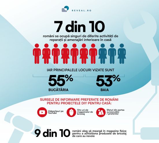 Conform datelor studiului Reveal Marketing Research, mai mult de doua treimi dintre romani (70%) declara ca obisnuiesc sa realizeze activitati de reparatii si amenajare interioara in propriile case, iar dupa cum era de asteptat barbatii sunt mai implicati in desfasurarea acestora comparativ cu femeile (79% vs. 62%).