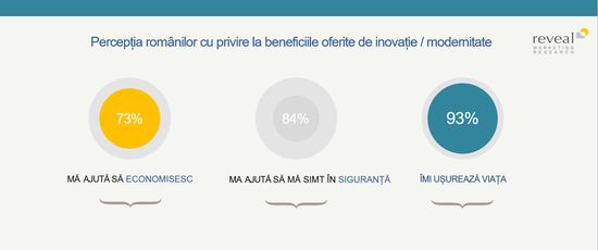 Respondentii care au participat la acest studiu sunt de acord cu faptul ca in principal inovatia/ modernitatea le usureaza viata (93%), ii ajuta sa se simta in siguranta (84%) si ii ajuta sa economiseasca (82%).