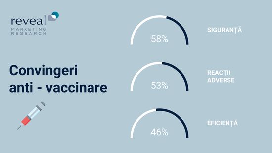 Romanii cred ca: “Este mai bine sa te imunizezi” (15%). De altfel, incertitudinea la nivel national planeaza asupra eficientei (46%), sigurantei (58%) si reactiilor adverse (53%) asociate vaccinului: „Mi-e teama de reactiile adverse”/„Nu cred in eficienta lui”/„Nu cred ca este testat suficient”.