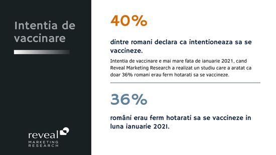 La nivel national, 6 din 10 romani nu intentioneaza sa se vaccineze, aceste persoane provenind in special din randul tinerilor cu varste cuprinse intre 16-24 ani (68%). Similar cu datele din ianuarie 2021, femeile declara ca nu se vor vaccina, un procent mai mare dintre acestea refuzand mai degraba din cauza reactiilor adverse (57% fata de 47% pentru barbati), in timp ce in randul barbatilor intentia de vaccinare este mult mai mare (43% pentru barbati fata de 40% pentru femei).