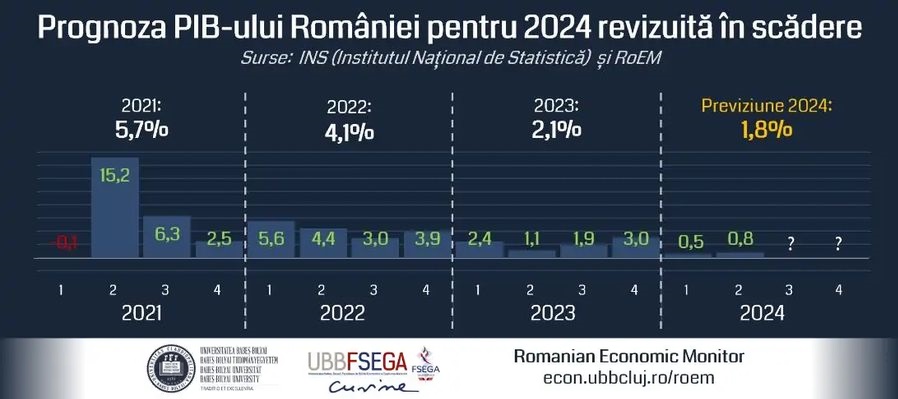 Cresterea anuala a PIB-ului Romaniei va fi moderata in 2024, de 1,8%, mult sub previziunile economice initiale, de 3%, in pofida tendintelor pozitive inregistrate in prima jumatate a anului - cresterea cererii interne, stimulata in principal de cresterea reala a veniturilor populatiei, precum si de reducerea treptata a inflatiei - si care se vor pastra si in perioada urmatoare, considera echipa de economisti a Facultatii de Stiinte Economice si Gestiunea Afacerilor (FSEGA) a Universitatii Babes-Bolyai (UBB) din Cluj-Napoca, care deruleaza proiectul de cercetare Romanian Economic Monitor (RoEM).In septembrie 2024, Institutul National de Statistica (INS) a publicat date provizorii privind cresterea economica a Romaniei in primele sase luni ale acestui an, conform carora PIB-ul Romaniei a inregistrat o crestere de 0,8% in trimestrul II fata de trimestrul I, in timp ce in primul trimestru s-a observat o crestere de doar 0,5%. Desi aceste cifre ar putea sugera o accelerare modesta a cresterii economice, ele sunt in realitate sub asteptarile analistilor, ceea ce prevesteste o crestere economica mai redusa pentru intregul an 2024, fata de cea preconizata la inceputul acestui an, arata cercetarea RoEM.