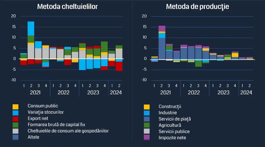 "Agricultura a fost grav afectata de seceta din aceasta vara, in special in ceea ce priveste culturile de porumb, iar acest impact se va resimti in indicatorii economici din a doua jumatate a anului. Industria continua sa urmeze trendul negativ al perioadei post-pandemie, amplificat de stagnarea economiei Germaniei, cel mai important partener comercial al Romaniei. Constructiile sunt sprijinite pe moment de investitiile guvernamentale, dar sectorul rezidential arata semne de slabiciune, ceea ce prevesteste o contributie mai redusa a acestui sector la cresterea PIB-ului, fata de contributia mult mai insemnata adusa anul trecut. Sectorul serviciilor, care a jucat un rol esential in revenirea economica post-pandemie, a adus doar o contributie minima in prima jumatate a anului 2024. Problemele din sectorul IT reprezinta un exemplu elocvent in acest sens, iar tendintele negative par sa persiste si in perioada urmatoare”, arata analiza economistilor RoEM.