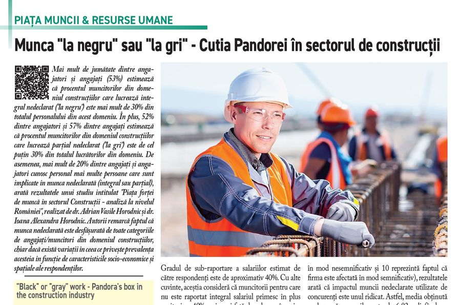 In continuare, rubrica dedicata pietei muncii aduce in prim plan un subiect devenit tabu pe piata de constructii, respectiv cel al muncii nedeclarate. Mai mult de jumatate dintre angajatori si angajati (53%) estimeaza ca procentul muncitorilor din domeniul constructiilor care lucreaza integral nedeclarat ("la negru") este mai mult de 30% din totalul personalului din acest domeniu. In plus, 52% dintre angajatori si 57% dintre angajati estimeaza ca procentul muncitorilor din domeniul constructiilor care lucreaza partial nedeclarat ("la gri") este de cel putin 30% din totalul lucratorilor din domeniu. De asemenea, mai mult de 20% dintre angajati si angajatori cunosc personal mai multe persoane care sunt implicate in munca nedeclarata (integral sau partial). Materialul analizeaza impactul muncii nedeclarate asupra sectorului de constructii si incearca sa estimeze dimensiunea acestuia. De asemenea, sunt analizate date ale Ministerului Muncii si Solidaritatii Sociale (MMSS) referitor la situatia accidentelor de pe piata muncii in constructii, dar si la controalele ITM pe santiere.
