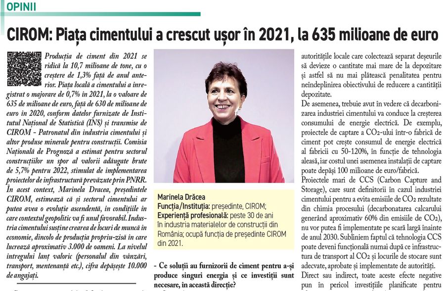 • Marinela Dracea, CIROM: Piata cimentului a crescut usor in 2021, la 635 milioane de euro