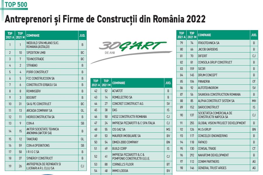 In incheiere, editia Mai 2022 a revistei Agenda Constructiilor include TOP 100 - Clasamentul companiilor globale de constructii, dupa cifra de afaceri, TOP 100 - Clasamentul antreprenorilor europeni de constructii, dupa cifra de afaceri si TOP 500 - Antreprenori si Firme de Constructii din Romania 2022, clasament elaborat in functie de cifra de afaceri realizata in 2020, dar si un clasament al principalelor companii pe baza mediei rezultatelor financiare inregistrate in perioada 2018-2020.