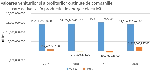 Cu o valoare totala de 14,1 miliarde de lei, veniturile aferente anului 2020 ale producatorilor de energie electrica din Romania au fost inferioare celor obtinute in anul 2019 - 15,3 miliarde lei, dar si celor obtinute in anii 2018 si 2017 (14,6, respectiv 14,2 miliarde de lei).Cu toate acestea, 2020 a fost anul in care companiile din domeniul productiei de energie electrica au inregistrat cele mai mari profituri, valoarea acestora depasind 2,2 miliarde de lei. In comparatia cu aceasta valoare, in anul 2017 profiturile generate de respectivele companii au fost de doar 0,8 miliarde de lei pe cand in anii 2018 si 2019 la nivelul pietei producatorilor de energie electrica din Romania s-au inregistrat pierderi.