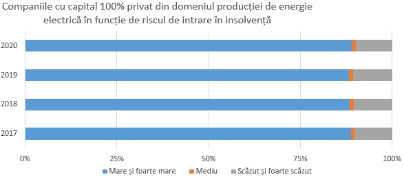 Spre deosebire de alte domenii de activitate, majoritatea producatorilor de energie electrica, indiferent de forma de constituire sau de prezenta statului in actionariat, au un risc ridicat de a intra in insolventa. Astfel, in toti cei patru ani analizati aproape 9 din 10 companii au un risc ridicat de a intra in insolventa si doar in cazul a una din 10 companii riscul fiind unul scazut.