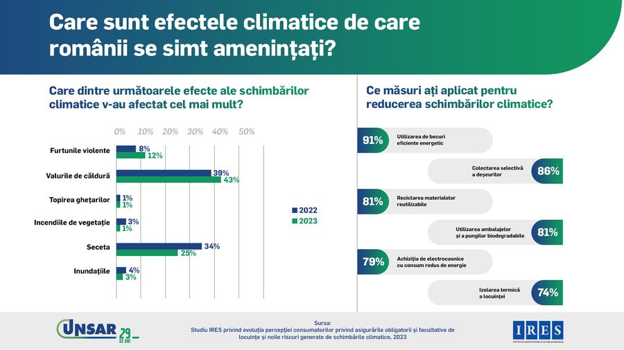 Efectele schimbarilor climatice sunt resimtite de romani. Astfel, acestia declara ca se simt amenintati in special de valurile de caldura (43% dintre romani), de seceta (25%), furtuni (12%), inundatii (3%), dar si de incendiile de vegetatie (1%) – conform celui mai recent studiu sociologic realizat de IRES la solicitarea UNSAR. Pentru al doilea an consecutiv, valurile de caldura inregistreaza o dinamica importanta din punct de vedere al efectelor resimtite de romani, cu o crestere de 10% fata de studiul realizat anul trecut. “Suntem expusi dezastrelor naturale si riscurilor generate de schimbarile climatice. Asadar, luarea unor decizii privind solutiile de protectie financiara impotriva unor astfel de fenomene extreme ar trebui sa devina o prioritate pentru fiecare dintre noi”, a precizat Alexandru Ciuncan, Presedinte & Director General al UNSAR.