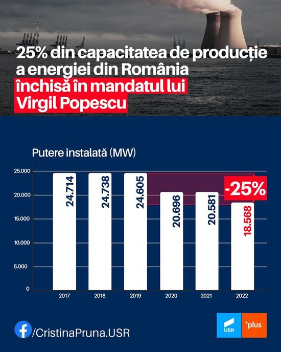„Facturile romanilor la energie cresc si pentru ca producem din ce in ce mai putina energie in Romania si devenim din ce in ce mai dependenti de importuri. In cei doi ani de cand Virgil Popescu a ajuns la ministerul Energiei, puterea instalata in capacitatile de productie a energiei s-a redus cu aproape 25% de la 24.605 MW la 18.568 MW. In acelasi timp puterea neta, adica acele unitati de productie care functioneaza efectiv, nu doar pe hartie, s-a redus de la 19.187 MW in 2019 la 16.907 MW in 2022. Tragedia nu este neaparat ca exista unitati de productie care se inchid, am putea spune ca este un proces normal intr-un sistem energetic atunci cand ele isi ating durata de viata. Tragedia adevarata este ca in locul acestora nu a aparut nimic si astfel dependenta noastra de importuri de energie a crescut considerabil. Tranzitia energetica nu inseamna doar sa inchizi. Asta era in stare sa faca oricine”, declara deputata USR Cristina Pruna.
