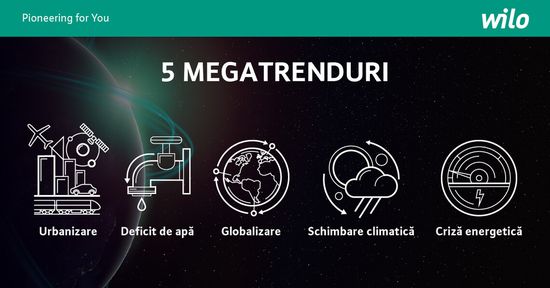 Astfel, sunt necesare solutii durabile pentru a satisface nevoile populatiei globale, conservand in acelasi timp resursele naturale pentru viitor. Avand in portofoliu produse de o eficienta maxima si asumandu-si rolul de furnizor de servicii complete si personalizate in managementul apei, Wilo s-a adaptat la acest megatrend in asa fel incat va putea asigura si in viitor alimentarea cu apa in orasele moderne si in zonele urbane inteligente in viitor.