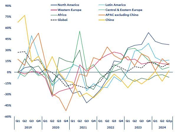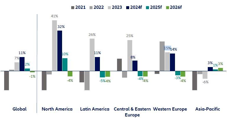 In ansamblu, analistii Allianz Trade se asteapta la o crestere moderata a insolventelor la nivel global in 2025 (+2%), prognoza care anticipeaza o reechilibrare notabila si neuniforma intre economii (Global Economic Outlook 2024-26: The great balancing act). Cresterea globala a insolventelor va fi determinata de doar trei din 10 tari, care vor inregistra o crestere a insolventelor in 2025 (de 7% an/an). In acest moment, pentru 2026 estimarile analistilor sugereaza o tendinta de scadere de -1%. Europa de Vest, Centrala si de Est vor prelungi dinamica inceputa in 2024, inregistrand o noua scadere la nivel regional de -4% de la un an la altul.