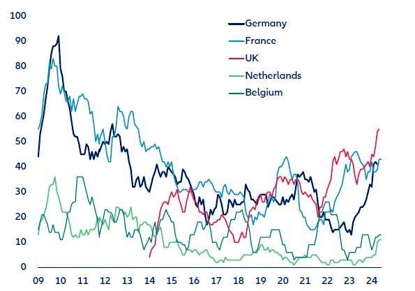Si in Franta, se preconizeaza un nou record al insolventelor pentru finalul anului 2024. In ciuda semnelor de atenuare din perioada recenta, tendinta ascendenta va incheia intr-un ritm puternic pentru al treilea an consecutiv (+18% anual, dupa +49% si +35% in 2022 si 2023). Astfel, numarul anual ar ajunge la 67.000 de cazuri, cu mult peste nivelurile pre-pandemice.