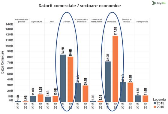 Creditul comercial reprezenta, in 2016, 36,8% din totalul datoriilor companiilor, un procent cu 56% mai mare decat valoarea creditului bancar (calculat la 133 miliarde lei). Cele mai mari datorii comerciale le inregistrau firmele din industrie (117 miliarde lei), in crestere cu peste 30% fata de anul precedent, urmate de cele din comert (80,6 miliarde lei), servicii si utilitati (34,6 miliarde lei) si constructii-imobiliare (29,4 miliarde lei).