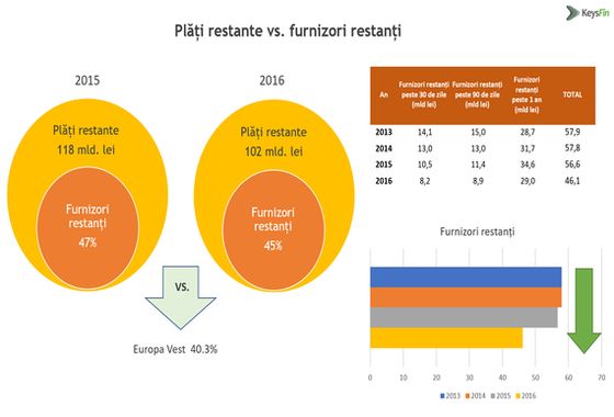 "Pe fondul cresterii economice semnificative din ultimii ani, dinamica platilor s-a imbunatatit, insa prea putin pentru a conta cu adevarat in relatiile comerciale. In timp ce in Romania, furnizorii restanti reprezinta 45%, la nivel european media este de 40,3%. Din punct de vedere sectorial, singura ramura economica in care disciplina la plata s-a imbunatatit in ultimii ani a fost industria (-2,6%), in timp ce la polul opus se afla constructiile si imobiliarele (+5%) si agricultura (+3,1%)", spun expertii Keysfin.