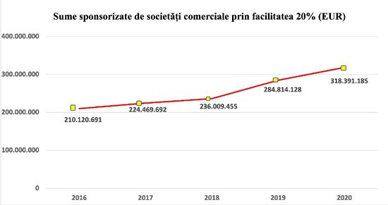 In pofida modificarilor legislative din 2017 si 2018, care au afectat potentialul facilitatii fiscale, sumele directionate s-au mentinut pe un trend crescator in ultimii cinci ani. In 2020, cresterea a fost de 12% fata de anul precedent.