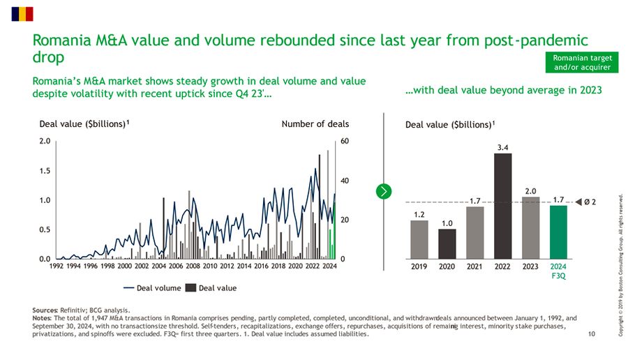 In primele noua luni ale anului 2024, piata de fuziuni si achizitii (M&A) din Romania a inregistrat tranzactii in valoare totala de 1,7 miliarde de dolari, marcand o crestere semnificativa fata de aceeasi perioada a anului trecut, cand valoarea acestora era de doar 134 de milioane de dolari, potrivit raportului global privind piata M&A realizat de Boston Consulting Group (BCG). Pentru intregul an 2023, valoarea totala a tranzactiilor a fost de 2 miliarde de dolari.Romania a avut a saptea cea mai mare tranzactie din Europa Centrala si de Est in 2024, respectiv achizitia OTB Bank de catre Banca Transilvania, in valoare de aproximativ 400 de milioane de dolari. Anul trecut, Romania ocupa pozitia a treia in clasament, propulsata de anuntul achizitiei lantului Profi de catre Ahold Delhaize, proprietarul Mega Image, pentru 1,4 miliarde de dolari.
