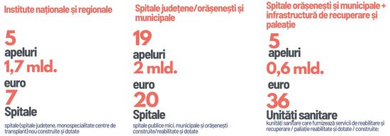 In ceea ce priveste PNRR, vor fi atat investitii in infrastructura, pentru digitalizarea spitalelor si eficienta energetica a cladirilor, cat si investitii pentru domeniul social, ce vizeaza sprijinirea persoanelor cu dizabilitati, integrarea pe piata muncii a persoanelor din medii defavorizate si realizarea de centre pentru varstnici.