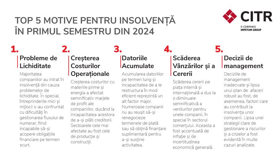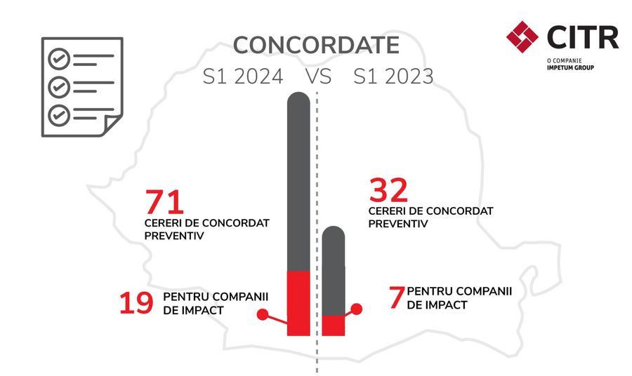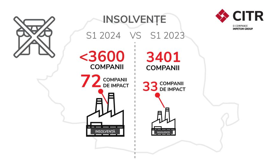 CITR, liderul pietei de insolventa si restructurare din Romania, anunta ca numarul companiilor care au apelat la procedurile de insolventa in primul semestru a crescut la peste 3.600, in crestere fata de cele 3.401 raportate in primele sase luni din 2023. Dintre acestea, 72 sunt companii de impact, cu active de peste 1 milion euro, comparativ cu cele doar 33 din aceeasi perioada a anului precedent. In ceea ce priveste numarul restructurarilor prin procedura de concordat preventiv, in primele sase luni ale anului au fost inregistrate 71 de cereri, dintre care 33 sunt in derulare in prezent. 19 dintre cereri vin de la companii de impact.