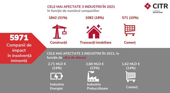 70% din cifra de afaceri la nivel national este generata de 32.027 de companii de impact (cu active totale de peste 1 mil. EUR). Dintre acestea, 42% sunt azi companii restructurabile sau aflate in insolventa iminenta, arata studiul companiilor de impact realizat de specialistii CITR, liderul pietei de insolventa si restructurare.Numarul companiilor in insolventa iminenta a scazut cu 10% in 2021 fata de 2020, dar a crescut cu 7% fata de nivelul din 2019, la debutul pandemiei.