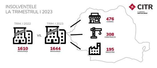 1.644 de companii au intrat in insolventa in primul trimestru din 2023, numar similar cu primul trimestru din 2022 cand au fost inregistrate 1.610 companii in insolventa. Dintre acestea, 23 (fata de 17 in trimestrul 1 al 2022) sunt companii de impact, care cumuleaza peste 1.950 de angajati, inregistreaza active imobilizate in valoare de peste 589 milioane lei si cifra de afaceri totala de 805 mil lei, arata analiza CITR, liderul pietei de insolventa si restructurare din Romania.„Evolutia numarului de companii in insolventa va fi influentata strict de efectul pe care cresterea dobanzilor sau inflatia le poate avea pe anumite tipuri de afaceri daca nu intervine o schimbare profunda, fie in abordarea statului cu privire la datoriile fiscale, fie in modul in care bancile trateaza situatia creditelor. Vom vedea probabil o crestere a numarului de cereri de insolventa generate in principal de cresterea datoriilor si de presiunea generata de creditori pentru a-si recupera creantele.” a spus Paul Dieter Cirlanaru, CEO CITR.