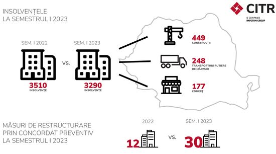 CITR, liderul pietei de insolventa si restructurare din Romania, analizeaza evolutia restructurarilor si insolventelor din primul semestru al anului 2023, iar rezultatele arata un interes crescut al mediului de business pentru noile produse de restructurare, cu 30 proiecte de concordat preventiv, dintre care doua sunt deja omologate de catre instanta. Numarul companiilor intrate in insolventa scade cu 6,2%, la 3.290, fata de 3.510 in aceeasi perioada a anului trecut. In acelasi timp, in randul companiilor de impact, numarul celor intrate in insolventa creste usor: 35, fata de cele 32 din primele sase luni ale anului 2022.„In ultimele sase luni, am simtit presiune asupra companiilor care trebuie sa faca fata unui cost de finantare mai mare sau incapacitatii de a plati datorii amanate foarte mult timp si care s-au obisnuit cu paradigma aceasta. Interesul crescut al antreprenorilor pentru noile mecanisme de restructurare este tot mai vizibil. 30 proiecte de concordat preventiv nu pare un numar mare, insa pentru economia Romaniei este un inceput de schimbare de mindset. Avand in vedere natura confidentiala a procedurilor de restructurare, nu avem vizibilitate asupra tuturor proiectelor deschise, mai ales asupra acordurilor de restructurare, asadar putem estima ca numarul companiilor care apeleaza la solutiile restructurarii este mai mare.” declara Paul Dieter Cirlanaru, CEO, CITR.