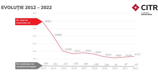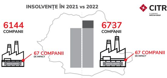Peste 6.700 de companii au intrat in insolventa in anul 2022, o crestere de 10% fata de anul 2021 (6.144). Dintre acestea, 67 sunt companii de impact, care cumuleaza peste 5.500 de angajati, inregistreaza active in valoare de peste 1,5 miliarde lei si datorii la bugetul statului de peste 170 milioane lei, arata analiza CITR, liderul pietei de insolventa si restructurare din Romania. Numarul companiilor de impact intrate in insolventa ramane 67, aproximativ 1% din totalul celor aflate in insolventa iminenta, procent similar inregistrat si in anul 2021.„In pofida incercarilor manifestate de reglementarile europene de a incuraja mecanismele de restructurare rapide si eficiente, constatam o mentinere a inertiei in ceea ce priveste companiile in dificultate. Desi in Romania avem doua mecanisme noi de restructurare introduse la timp in legislatia noastra, observam ca doar 1% dintre companiile de impact care ar putea beneficia de pe urma unei restructurari au intrat sub protectia legii insolventei, majoritatea fiind proceduri la cererea creditorilor, nu din vointa proprie” a spus Paul Dieter Cirlanaru, CEO CITR.