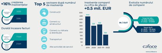“Primul semestru al anului 2022 contureaza un tablou al mediului economic si de afaceri plin de provocari. Situatia insolventelor in S 1 confirma tensiunile prin care trec firmele in incercarea de a supravietui intr-un cadru aflat in continua schimbare. In acest context cu foarte multe incertitudini si provocari pentru mediul de afaceri, probabil numarul companiilor care isi vor intrerupe activitatea va inregistra o crestere cu doua cifre, amplitudinea si impactul financiar cauzate de companiile insolvente fiind dependente de evolutia contextului geopolitic si a tabloului macroeconomic. Este important sa urmarim toate aceste evolutii cu atentie si sa raspundem nevoilor cu solutii ancorate in realitatea curenta. Ca furnizor de servicii de management al riscului de credit, Coface va continua sa sprijine mediul de afaceri prin solutii bazate pe know how-ul adunat in cei peste 25 de ani de prezenta pe piata locala,” a declarat Alina Popa, Country Manager, Coface Romania.