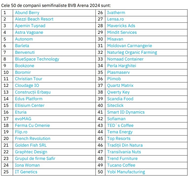 Comitetul de Nominalizare BVB Arena a selectat cele 50 de companii semifinaliste ale programului, dintr-un total de 409 de nominalizari valide pe platforma www.bvbarena.ro. Din 8 iulie pana pe 31 iulie, publicul va putea alege, prin vot pe www.bvbarena.ro, 3 dintre cele 15 companii romanesti finaliste ale editiei BVB Arena 2024. Programul BVB Arena, derulat din 2017 de catre Bursa de Valori Bucuresti, a depasit 1.500 de companii inscrise in program. Fiecare editie a atins noi recorduri in ceea ce priveste interesul fata de program, materializat in numarul tot mai mare al companiilor nominalizate."Ca in fiecare an, am asteptat cu nerabdare selectia companiilor semifinaliste pentru a ne confirma, inca o data, valoarea pe care antreprenorii romani o aduc pentru economia romaneasca. In mod direct, prin produsele si serviciile pe care le produc, prin ingeniozitatea afacerilor pe care le conduc, si indirect prin bunastarea pe care o genereaza propriilor angajati si familiilor acestora. Editia din acest an nu face exceptie, avem companii nominalizate care sunt mai mult sau mai putin cunoscute publicului larg, si ma bucur ca au acceptat sa faca parte din comunitatea BVB Arena. Fiecare companie parte a programului, inca din etapa de nominalizare, este de fapt castigatoare, intrucat programul de mentorat BVB Arena le este destinat tuturor celor nominalizati”, a declarat Radu Hanga, Presedintele Bursei de Valori Bucuresti.