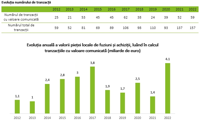In 2022, au avut loc zece tranzactii cu o valoare comunicata sau estimata de minimum 100 de milioane de euro, fata de 12, in 2021.