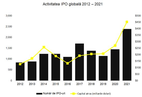 In contextul unui mediu economic incert care a dominat in 2021, piata IPO globala a avut un an exceptional, doborand in mod constant recorduri atat in privinta volumului, cat si a valorii tranzactiilor, pana in trimestrul al IV-lea (T4). In ultimul trimestru, perspectivele incep sa se schimbe odata cu aparitia variantei Omicron a virusului Covid-19, a persistentei tensiunilor geopolitice si a cresterii volatilitatii pietelor. Per total, in 2021 s-au inregistrat 2.388 de tranzactii care au atras capitaluri in valoare de 453,3 miliarde de USD, in crestere cu 64% si, respectiv, 67% fata de anul anterior, conform raportului EY Global IPO Trends Report 2021. 2021 a debutat cu lansarea vaccinurilor impotriva Covid-19, cu o redresare a economiilor globale si cu ample lichiditati pe piata, generate de programele guvernamentale de stimulare a economiei, care au adus optimism pe pietele IPO globale. T4 2021 a fost cel mai activ al patrulea trimestru in functie de numarul de tranzactii dupa T4 2007, inregistrand o crestere de 16% a volumului tranzactiilor IPO (621) si de 9% a valorii acestora (112,2 miliarde de USD) fata de perioada similara a anului 2020.