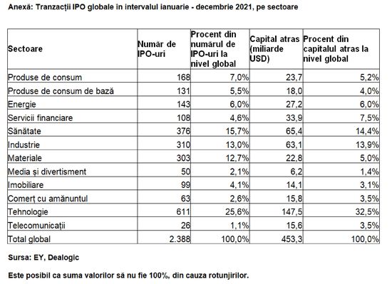 La nivel mondial, sectorul tehnologiilor a inregistrat cele mai multe tranzactii IPO (611) pentru al saselea trimestru consecutiv si cea mai mare valoare a tranzactiilor (147,5 miliarde de USD) pentru al saptelea trimestru consecutiv. Sectorul sanatatii s-a clasat pe locul al doilea ca numar si valoare a tranzactiilor, cu 376 de IPO-uri in valoare de 65,4 miliarde de USD. La mica distanta, industria ocupa urmatorul loc in top, cu 310 IPO-uri in valoare de 63,1 miliarde de USD.