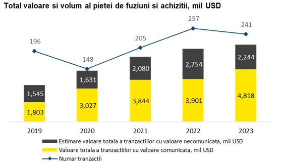 Piata romaneasca de fuziuni si achizitii (M&A) a inregistrat 241 de tranzactii1 in 2023, cu o valoare totala estimata de 7,1 miliarde USD2. Aceasta reprezinta o crestere de 6,1% fata de valoarea estimata in 2022 (6,6 miliarde USD) si o reducere de 6,2% ca numar de tranzactii fata de 2022 (257).La nivel global, in 2023, activitatea de fuziuni si achizitii si-a continuat traiectoria descendenta, prelungind declinul observat in 2022 si marcand un minim al ultimilor 10 ani in ceea ce priveste valoarea totala a tranzactiilor. Aceasta tendinta a fost cauzata de factori precum cresterea costurilor de finantare, intensificarea tensiunilor geopolitice, incetinirea generala a activitatii economice si accentuarea restrictiilor de reglementare. Multiplele perturbari au dus la scaderea valorii pietei globale de fuziuni si achizitii cu 13% de la an la an, in timp ce activitatea de fuziuni si achizitii din Europa a scazut cu 19%. In acest context, activitatea de fuziuni si achizitii din Romania in 2023, asemenea anului 2022, a continuat sa sfideze atat tendintele globale, cat si pe cele regionale, remarcandu-se inca o data prin performantele sale.
