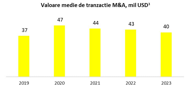 In 2023, dimensiunea medie a tranzactiilor a scazut usor, la 40 de milioane USD, continuand tendinta descendenta post 2020. Acest efect este amplificat si de tendinta constanta a neraportarii valorilor pentru tranzactiile mai mari. In cele din urma, cei mai activi investitori dupa tara de origine au provenit din SUA (9,5% din tranzactiile inbound), Olanda (8,6%) si Franta, Elvetia si Polonia (7,6% fiecare).