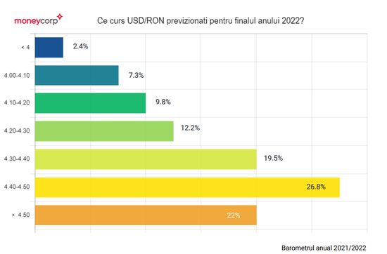 In ceea ce priveste evolutia monedei americane, cei mai multi manageri chestionati (26,8%) vad o depreciere mai accentuata a leului, peste pragul de 4.40-4.50 lei, iar 22% sunt convinsi ca dolarul va trece de 4,50 lei.