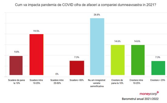 Potrivit barometrului anual Moneycorp 2021-2022, in cadrul caruia au fost chestionati 1225 de manageri de companii din diverse domenii de activitate, mediul de afaceri s-a adaptat conditiilor pandemice in acest an. Intrebati cum le-a afectat noul val de COVID business-urile, cei mai multi respondenti (26,8)% au afirmat ca nu au inregistrat o variatie semnificativa.