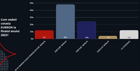 Pe de alta parte, alti 12% dintre manageri mizeaza pe un curs extrem de stabil, in jurul valorii de 4,95 lei/euro.