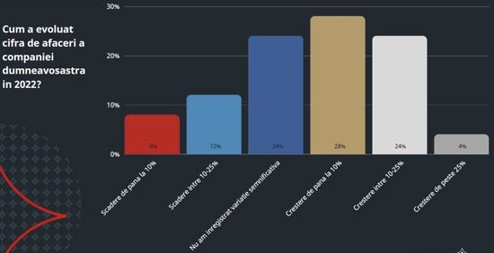 Pentru cele mai multe companii, 2022 a fost un an in care companiile au reusit sa fructifice oportunitatile si sa-l transforme intr-unul de crestere. 28% au inregistrat o crestere a cifrei de afaceri de pana la 10%, iar 28% peste acest nivel. 24% nu au inregistrat o variatie semnificativa, iar 12% au raportat o scadere a business-ului intre 10-25%.
