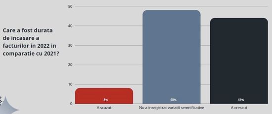 Potrivit rezultatelor barometrului, 44% dintre cei chestionati se confrunta cu o durata crescuta de incasare a facturilor, in timp ce 48% considera ca a ramas la acelasi nivel ca in 2021.