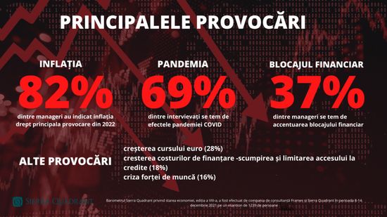 Daca in precedentul barometru, realizat in primavara, principala provocare o reprezenta pandemia si efectele sale (restrictii, scaderea consumului etc.), mentionata de 58% dintre respondenti, in noul sondaj, realizat in decembrie, cresterea inflatiei a trecut in prim-plan, remarcata de 82% dintre cei chestionati (fata de 43% in precedentul barometru).