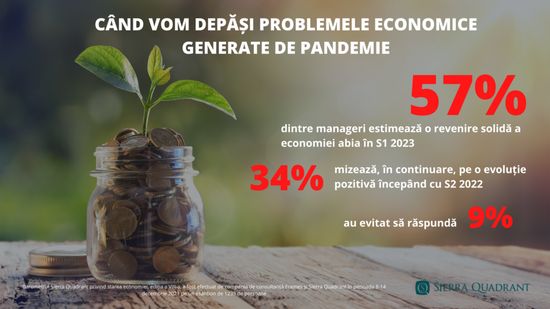 57% estimeaza, astfel, o revenire solida a economiei abia in S1 2023, 34% mizeaza, in continuare, pe o evolutie pozitiva incepand cu S2 2022, iar 9% au evitat sa se pronunte.