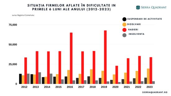 Potrivit expertilor de la Sierra Quadrant, datele statistice din primele sase luni vin sa confirme estimarile companiei, facute la inceputul anului, care arata ca numarul firmelor cu probleme ar putea atinge, in 2023, un maxim al ultimilor ani, pe fondul scaderii puternice a consumului, urmare a inflatiei, scumpirii creditarii si accentuarii blocajului financiar.
