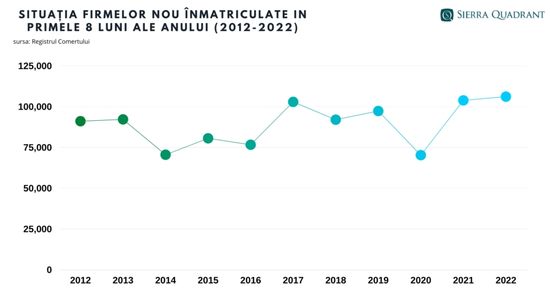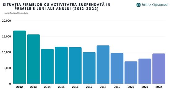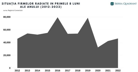 Potrivit datelor de la Registrul Comertului, prelucrat de expertii Sierra Quadrant, numarul firmelor dizolvate a crescut cu 19,22%, la 23.016, cel al afacerilor radiate cu 9,6% (46.304) iar cel al societatilor cu activitatea suspendata cu 20,4% (9598).