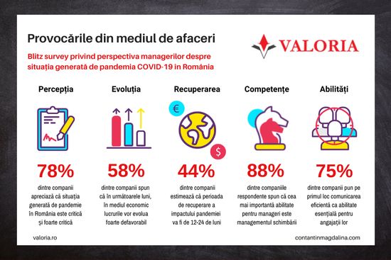 „Prin acest blitz survey am vrut sa aflam perspectiva managerilor si directorilor executivi cu privire la evolutia impactului pandemiei. Desi companii din domeniile care nu au fost puternic afectate de pandemie au reusit rezultate peste asteptari in 2021, acestea se confrunta cu numeroase probleme zi de zi. Pentru a le depasi este nevoie de o atentie continua la pregatirea si motivarea angajatilor, iar studiul arata care sunt competentele de interes pentru manageri si echipele lor”, spune Elena Badea, Managing Director, Valoria. Pentru informatii suplimentare, click aici!